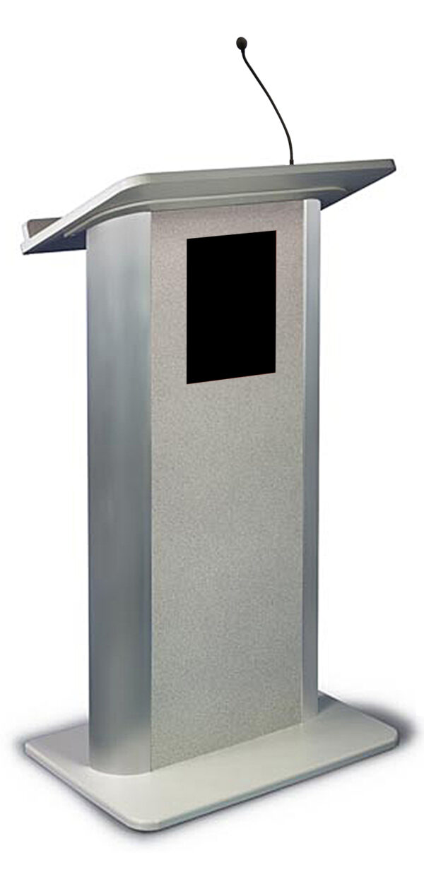 The Wireless Contemporary Flat Panel Lecterns – includes: UPGRADED: Integrated Side-by-Side finger-tip Control Panel: 150-WATTS amplifier, Built-in 16 CHANNEL UHF wireless receiver, 584 to 608 MHz, Built-in Bluetooth module. 10’ AC power cord included. One built-in 6-in. x 8-in. oval speaker, unidirectional condenser gooseneck mic. PLUS, a Wireless HANDHELD Mic with built-in Transmitter ▪ Requires two “AA” batteries (included).